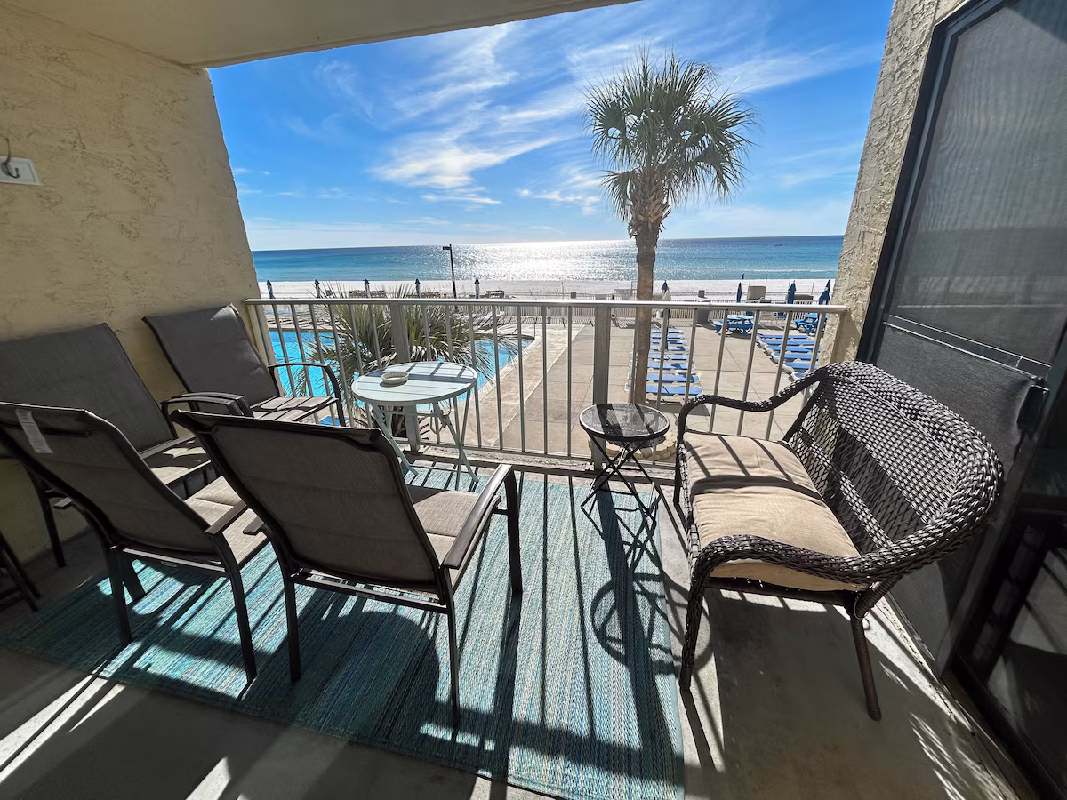 - The private balcony, accessible from both the living room and master bedroom, offers an outstanding view of the pools and beach. There is lovely deck furniture so you can enjoy the view of the Gulf of Mexico all day. You may catch the dolphins at play or enjoy a relaxing dinner on your private balcony while watching the sunset.